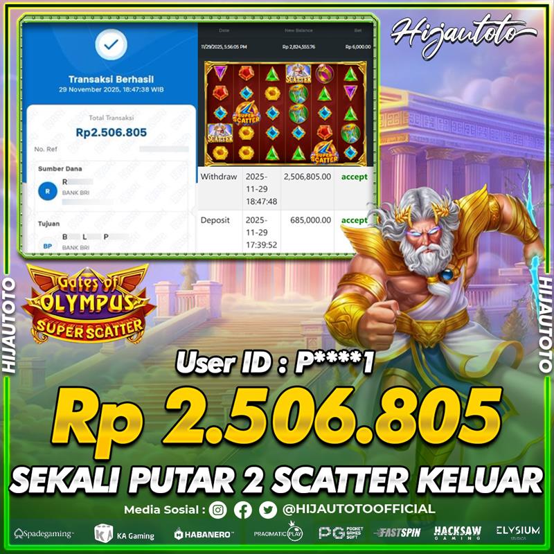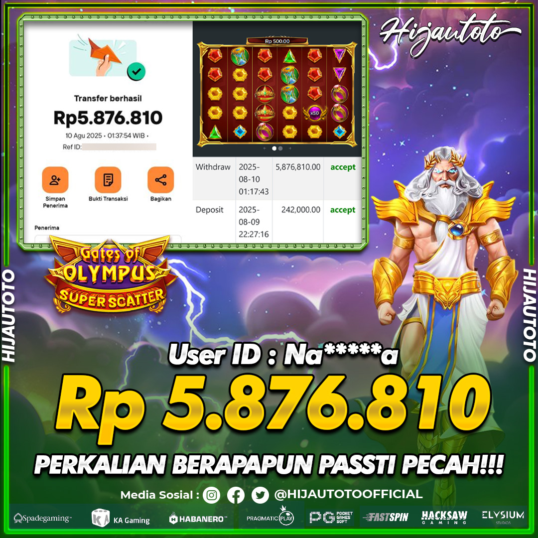 Selamat Kepada Member HIJAUTOTO P****1 Telah Jackpot Di SLOT GATES OF OLYMPUS SUPER SCATTER