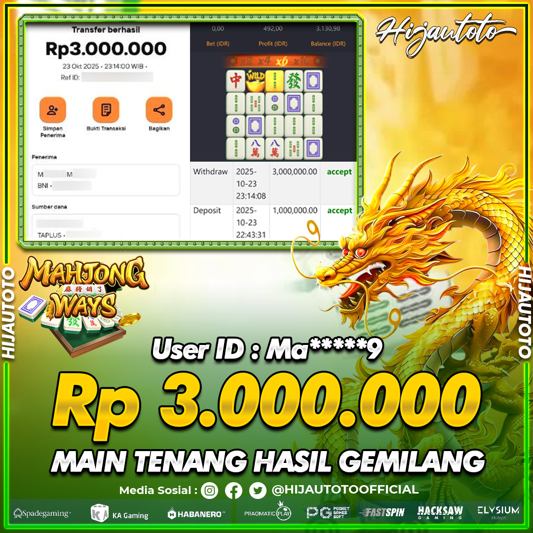 Selamat Kepada Member HIJAUTOTO MA*****9 Telah Jackpot Di SLOT MAHJONG WAYS