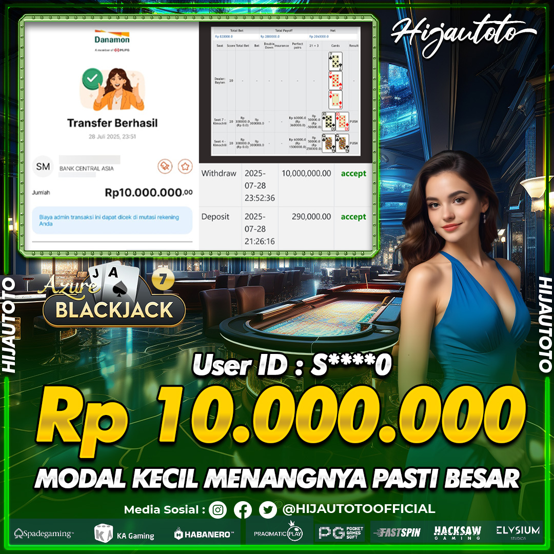 Selamat Kepada Member HIJAUTOTO S****0 Telah Jackpot Di LIVE CASINO AZURE BLACKJACK