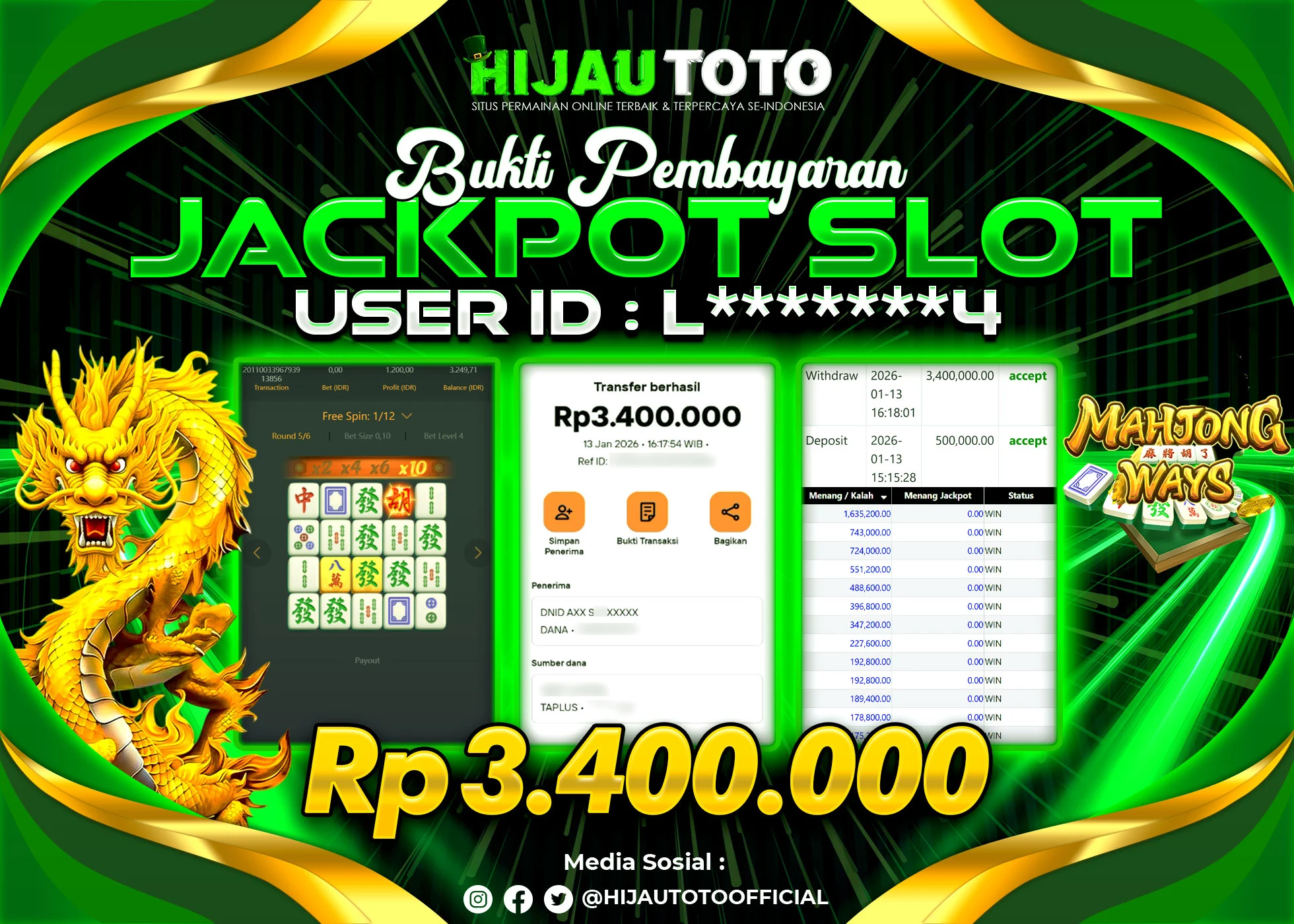 Selamat Kepada Member HIJAUTOTO AN******8 Telah Jackpot Di SLOT MAHJONG WAYS