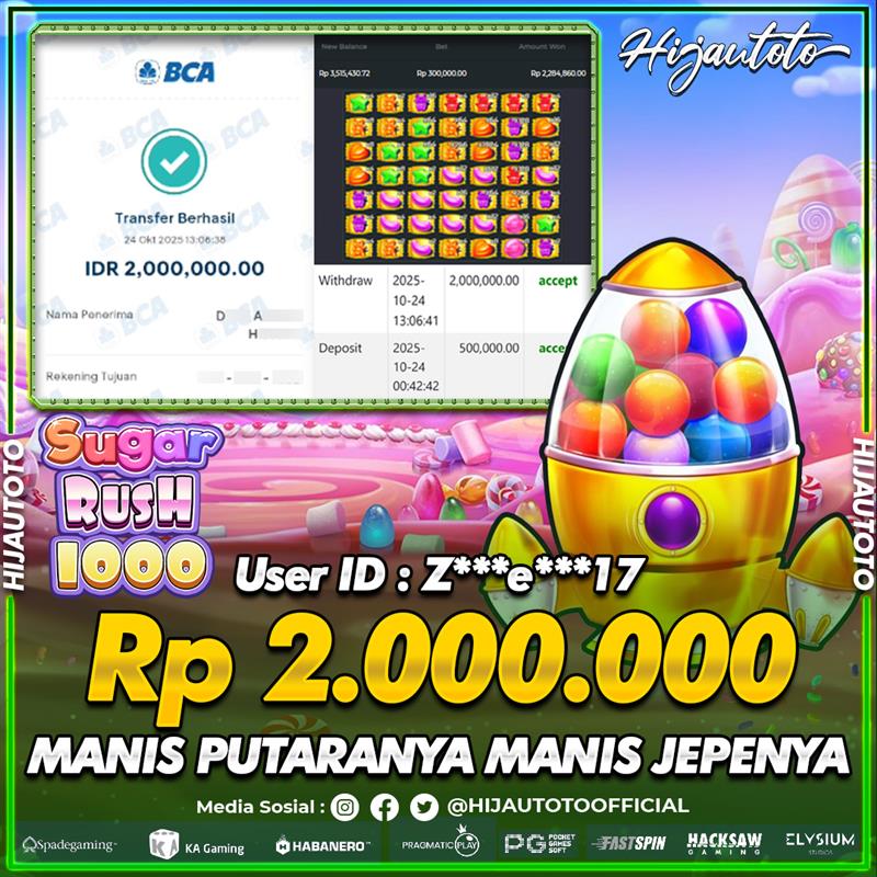 Selamat Kepada Member HIJAUTOTO ZA******17 Telah Jackpot Di SLOT SUGAR RUSH 1000