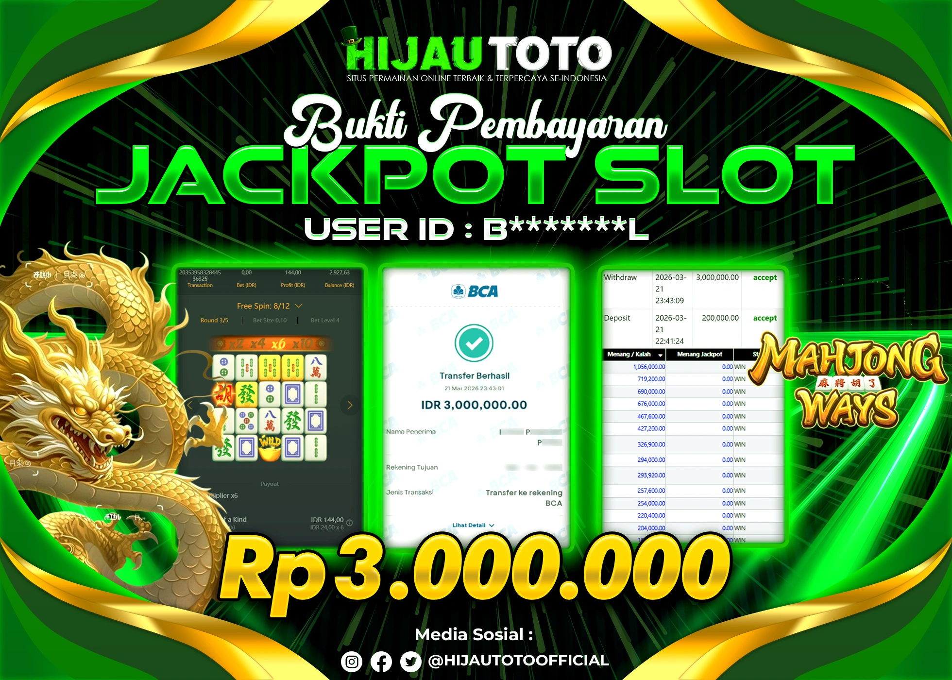 Selamat Kepada Member HIJAUTOTO B*******L Telah Jackpot Di SLOT MAHJONG WAYS