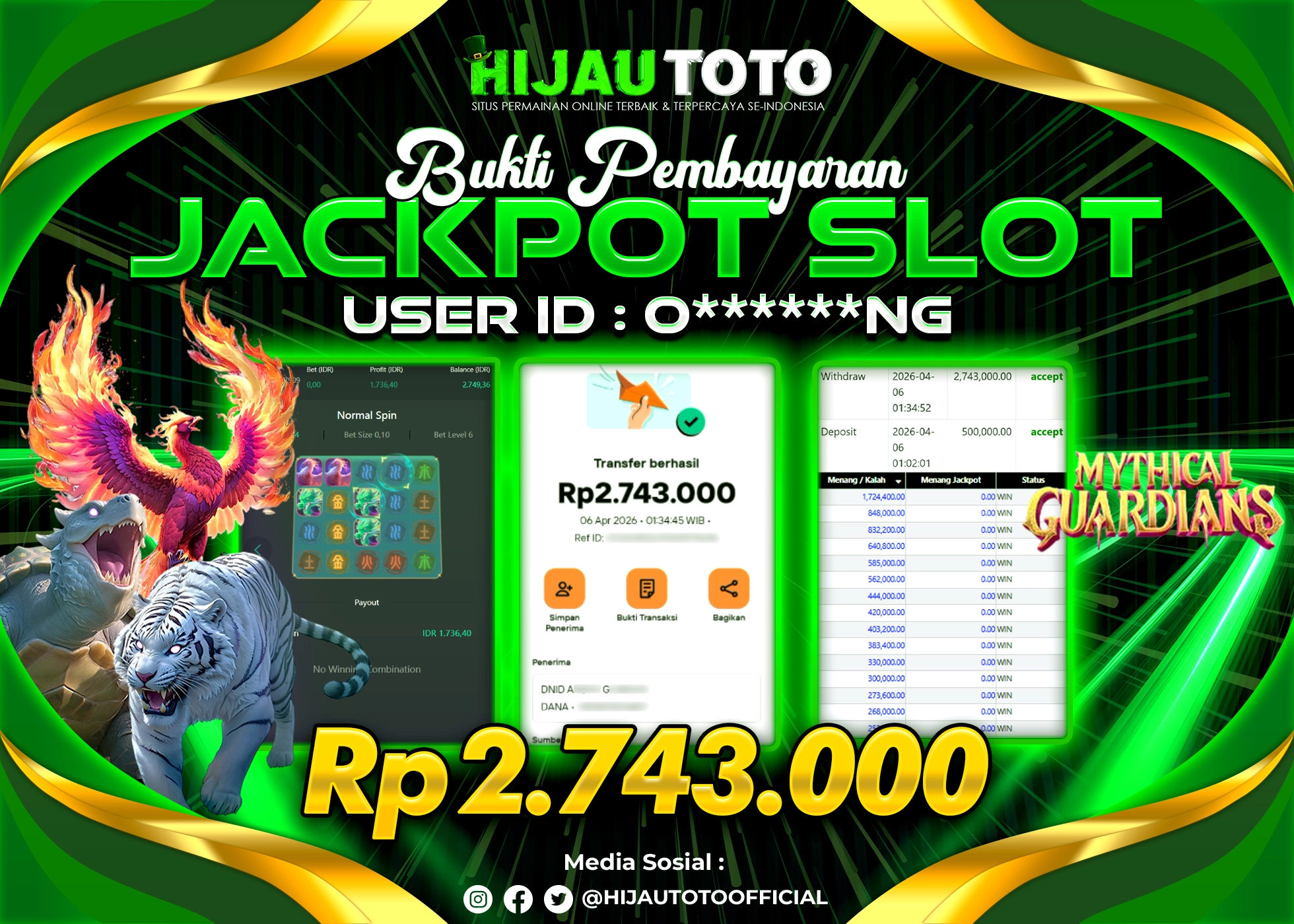 Selamat Kepada Member HIJAUTOTO O******NG Telah Jackpot Di SLOT MYTHICAL GUARDIANS
