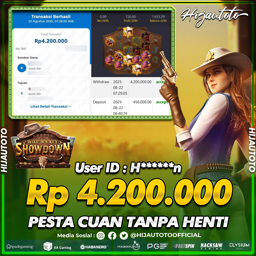 Selamat Kepada Member HIJAUTOTO H******N Telah Jackpot Di SLOT WILD BOUNTY SHOWDOWN