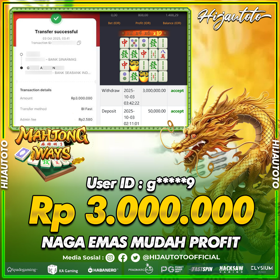 Selamat Kepada Member HIJAUTOTO G*****9 Telah Jackpot Di SLOT MAHJONG WAYS