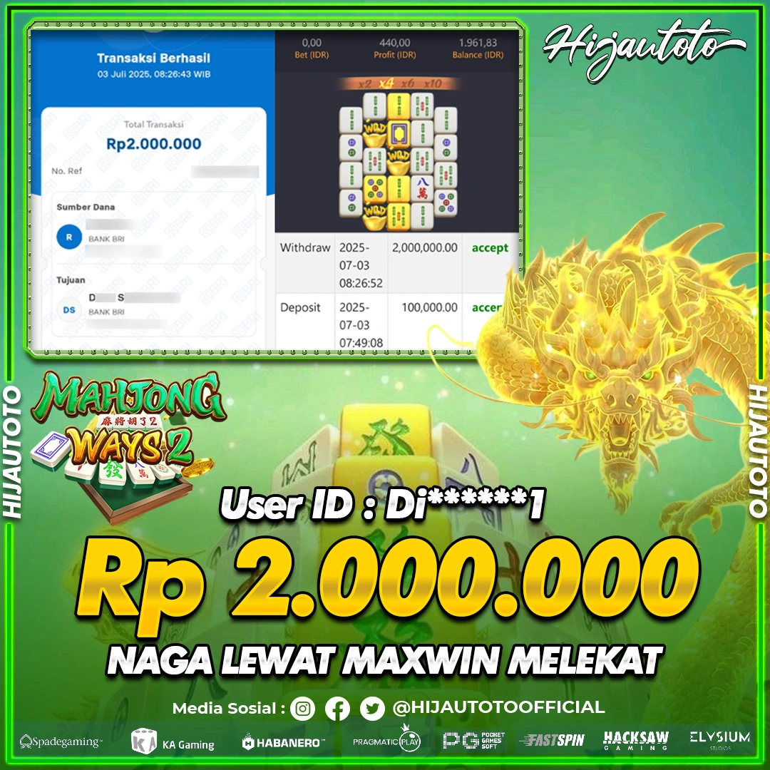 Karena berhasil memenangkan Rp.Rp.2.820.000 dari permainan seru SLOT MAHJONG WAYS di HIJAUTOTO! πŸ’°πŸ’Έ