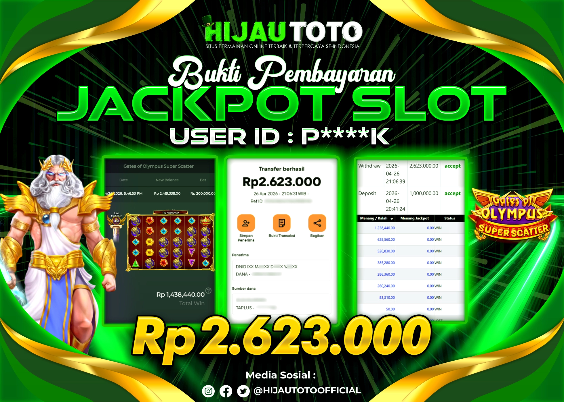 Selamat Kepada Member HIJAUTOTO A****R Telah Jackpot Di SLOT GATES OF OLYMPUS 1000