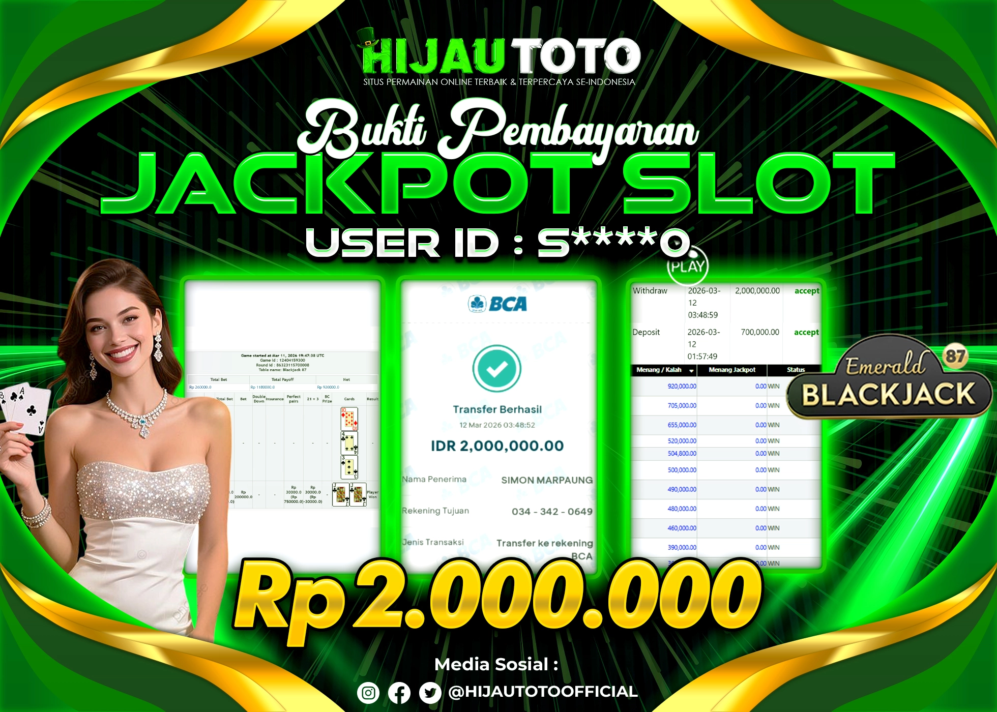 Selamat Kepada Member HIJAUTOTO S****0 Telah Jackpot Di SLOT LIVE CASINO EMERALD BLACKJACK 87