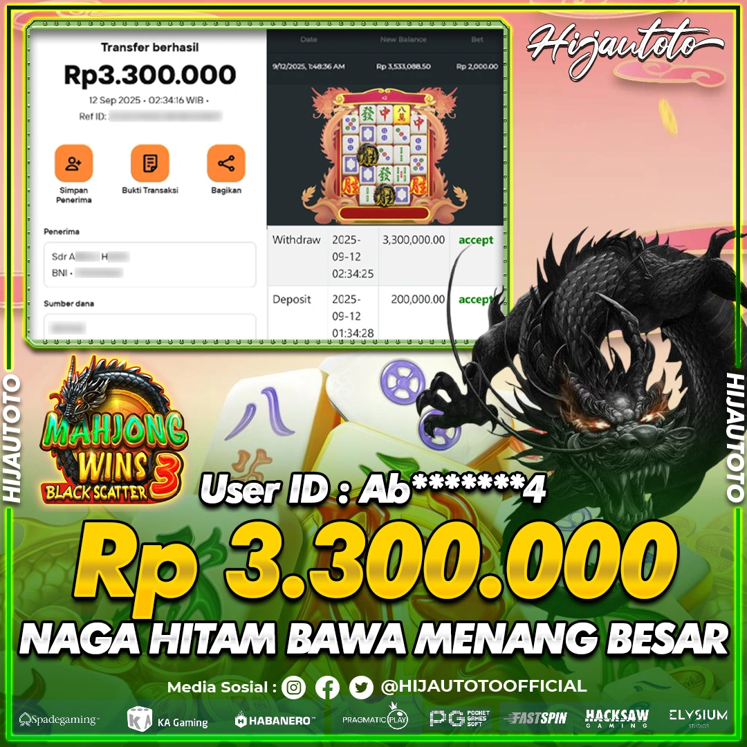 Selamat Kepada Member HIJAUTOTO AB*******4 Telah Jackpot Di SLOT MAHJONG WINS BLACK SCATTER 3