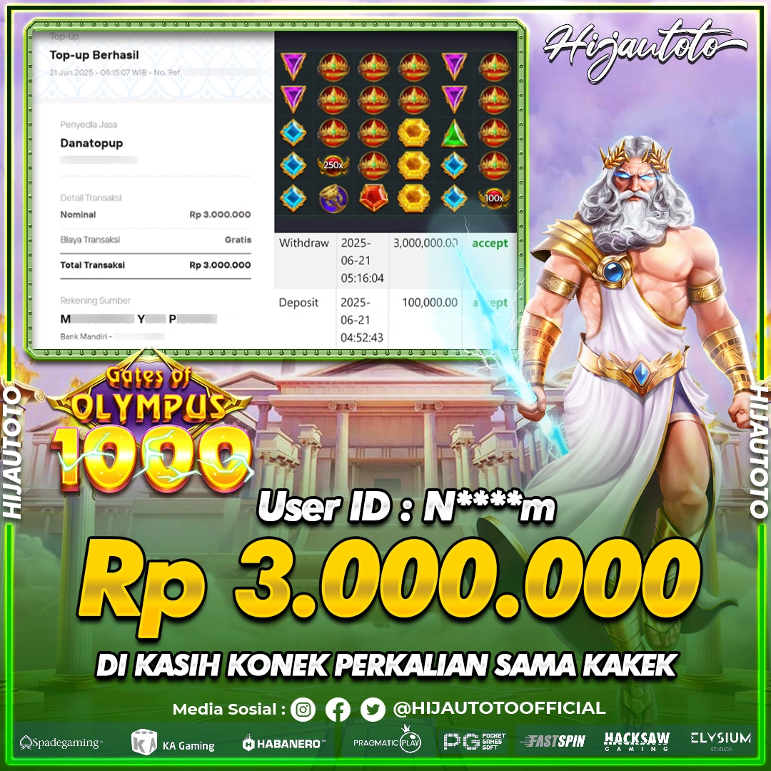 Selamat Kepada Member HIJAUTOTO N****M Telah Jackpot Di SLOT GATES OF OLYMPUS 1000