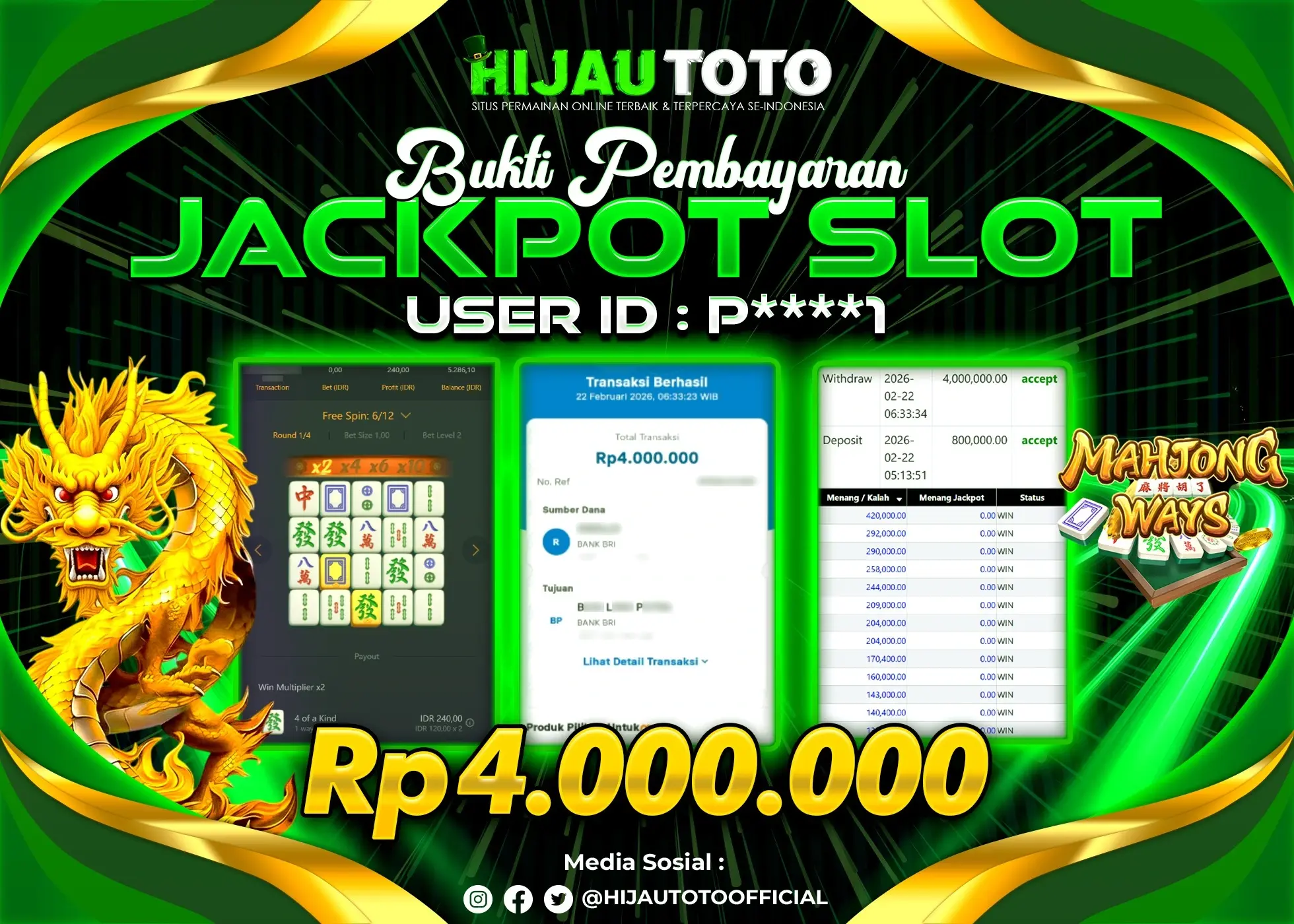Selamat datang di HIJAUTOTO, tempatnya seru-seruan dan cuan besar! Mulai main cukup dengan modal Rp5.000 aja, taruhan super murah dari Rp100 perak! Mau main slot yang penuh warna? Atau togel dari 20 pasaran paling hits? Atau mungkin tembak ikan yang bikin deg-degan? Tenang, ada juga taruhan bola, sabung ayam, dan live casino yang bikin suasana makin hidup! Daftar sekarang dan dapetin bonus new member 100% langsung, biar modalmu makin tebal. Deposit gampang banget, bisa pakai QRIS, dan kalau butuh bantuan, customer service kita siap 24 jam nonstop. Jadi, tunggu apa lagi? Yuk, gabung dan bawa pulang kemenangannya cuma di HIJAUTOTO!