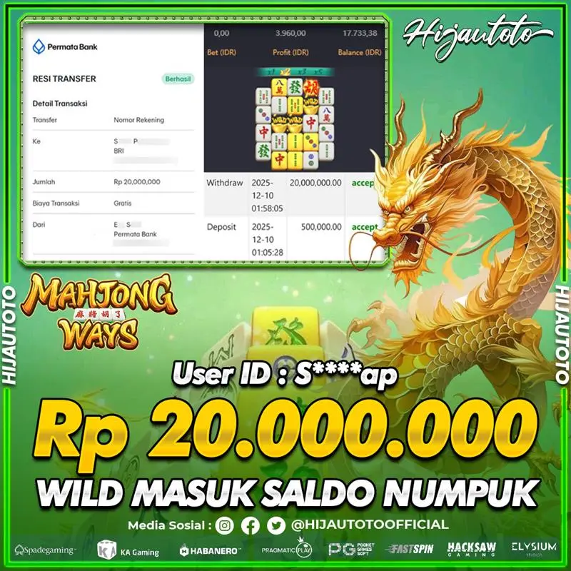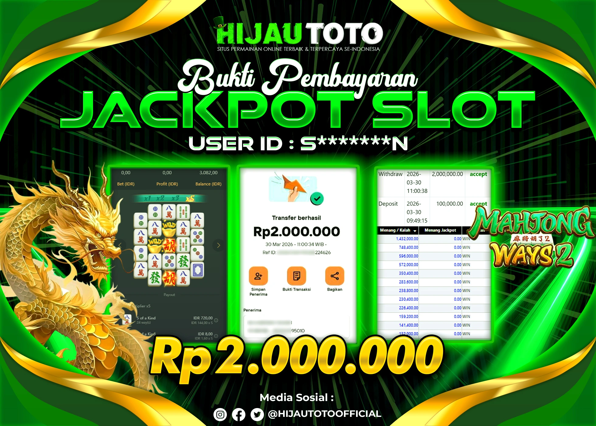 Selamat Kepada Member HIJAUTOTO S*******N Telah Jackpot Di SLOT MAHJONG WAYS 2