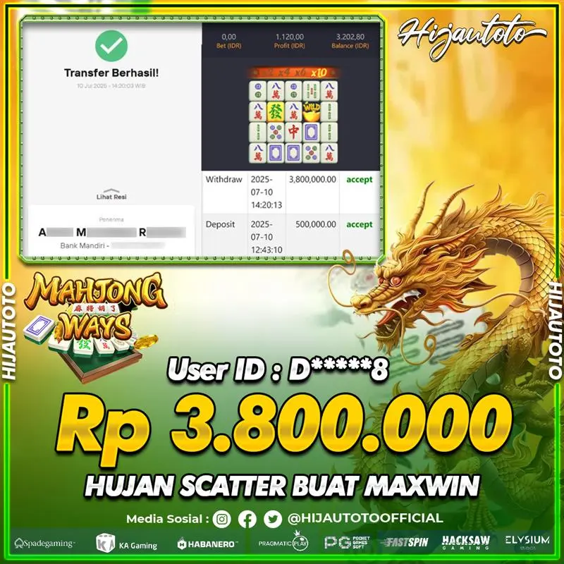 Selamat Kepada Member HIJAUTOTO NA******A Telah Jackpot Di SLOT MAHJONG WAYS