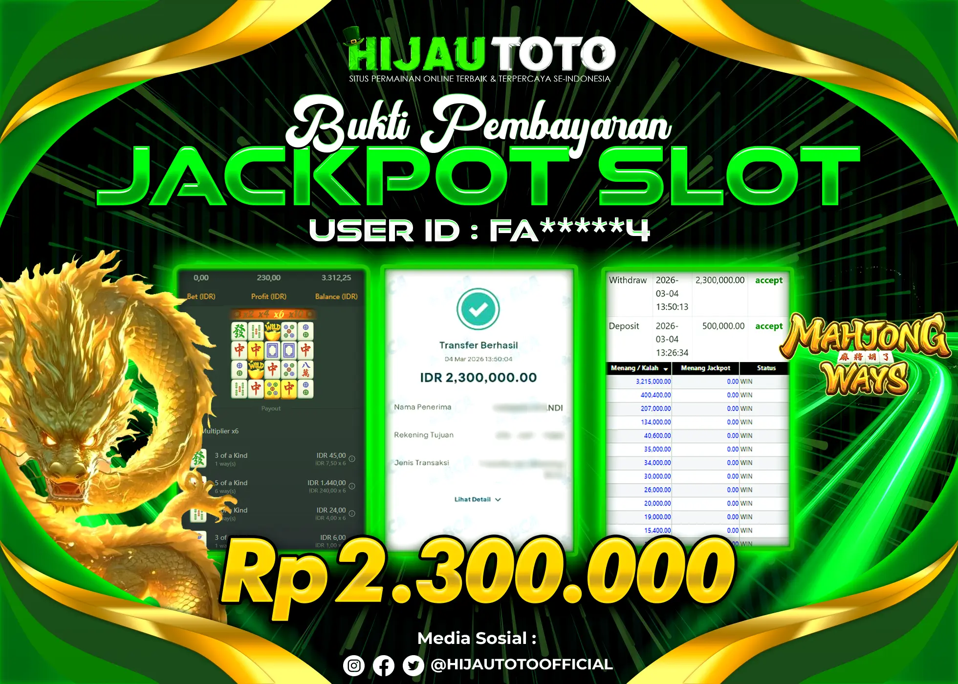 Selamat Kepada Member HIJAUTOTO FA*****4 Telah Jackpot Di SLOT MAHJONG WAYS