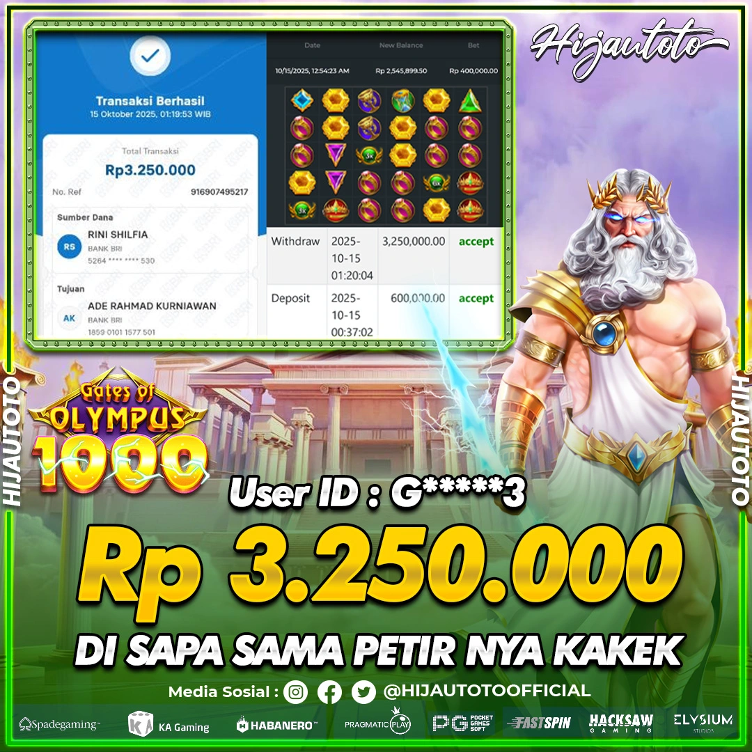 Selamat Kepada Member HIJAUTOTO G*****3 Telah Jackpot Di SLOT GATES OF OLYMPUS 1000