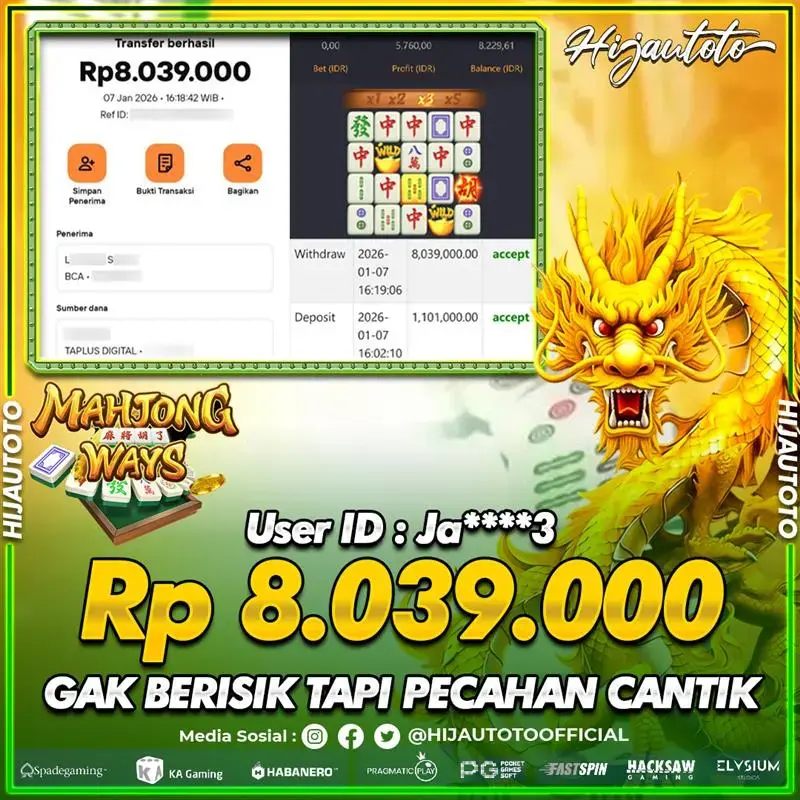 Selamat Kepada Member HIJAUTOTO JA****3 Telah Jackpot Di SLOT MAHJONG WAYS