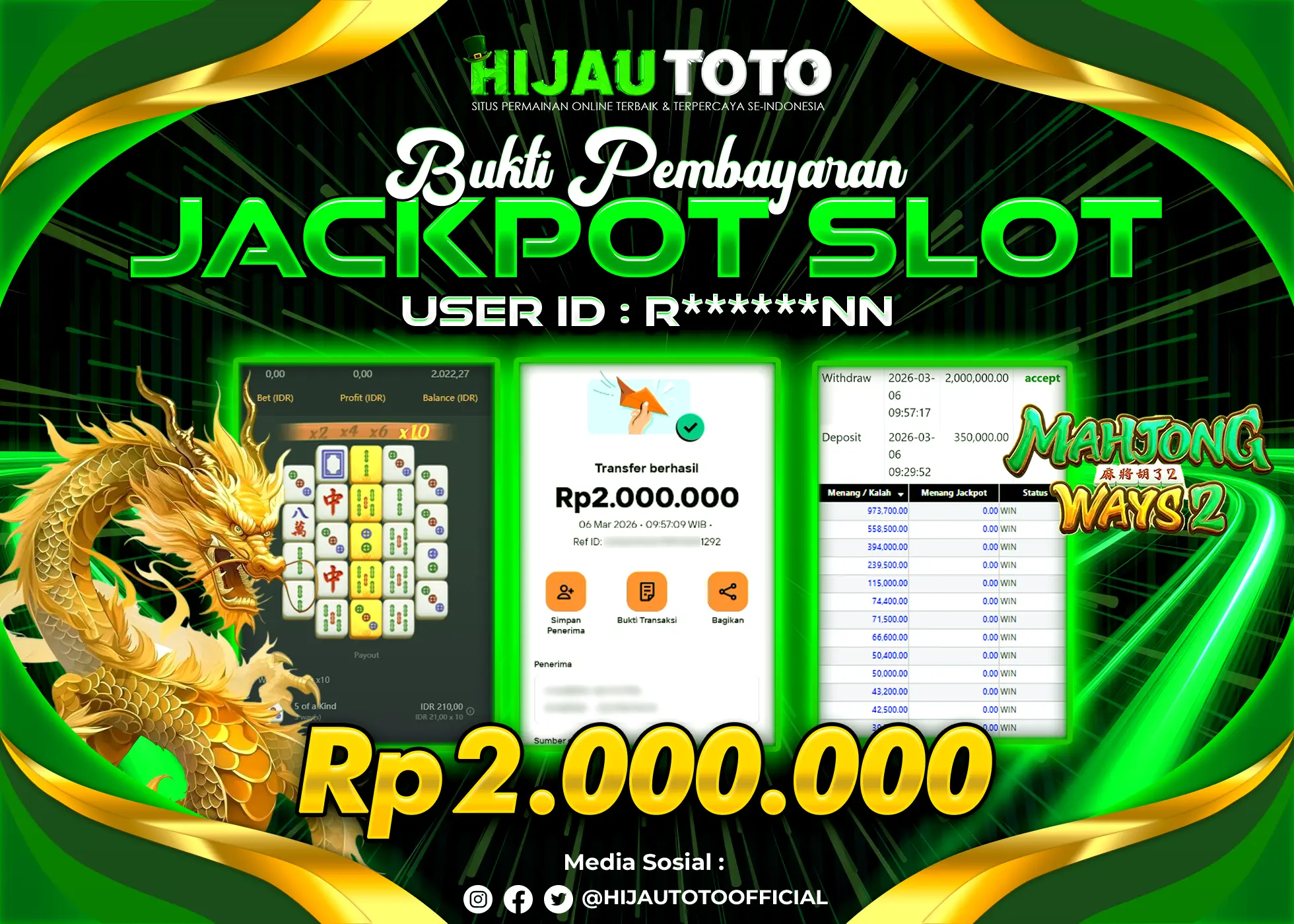 Bergabung dengan HIJAUTOTO sangat mudah dan cepat. Cukup lakukan pendaftaran dengan data lengkap, lakukan deposit minimal Rp5.000 melalui berbagai metode termasuk QRIS, dan mulai bertaruh dengan minimal taruhan Rp100. Dapatkan juga bonus new member 100% untuk modal bermain lebih besar.