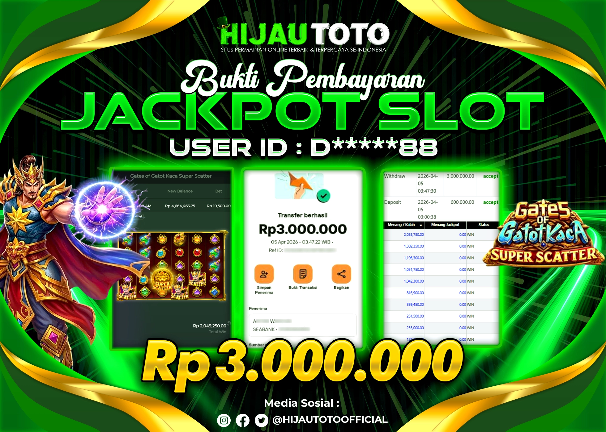 Selamat Kepada Member HIJAUTOTO D*****88 Telah Jackpot Di SLOT GATES OF GATOTKACA SUPER SCATTER