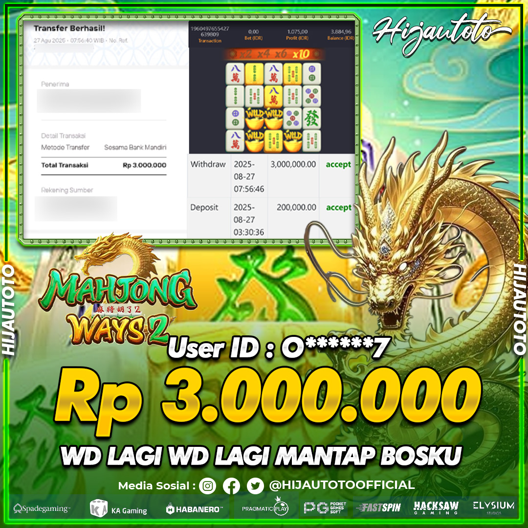 Selamat Kepada Member HIJAUTOTO O******7 Telah Jackpot Di SLOT MAHJONG WAYS 2