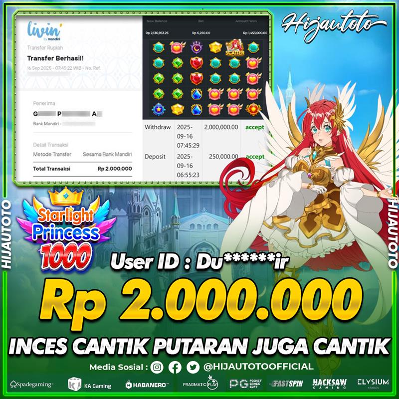 Selamat Kepada Member HIJAUTOTO DU******IR Telah Jackpot Di SLOT STARLIGHT PRINCESS 1000