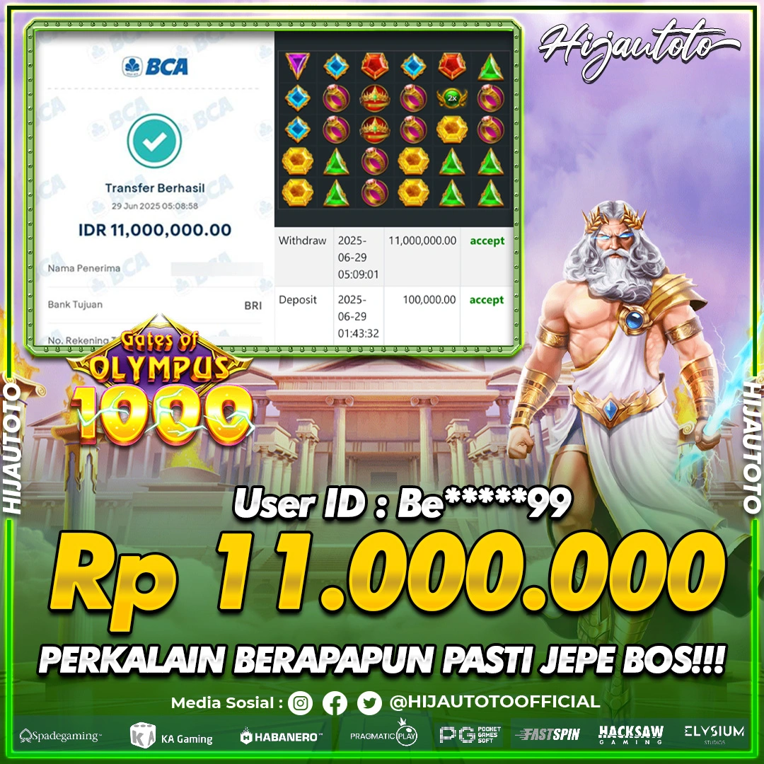 Selamat Kepada Member HIJAUTOTO BE*****99 Telah Jackpot Di SLOT GATES OF OLYMPUS 1000