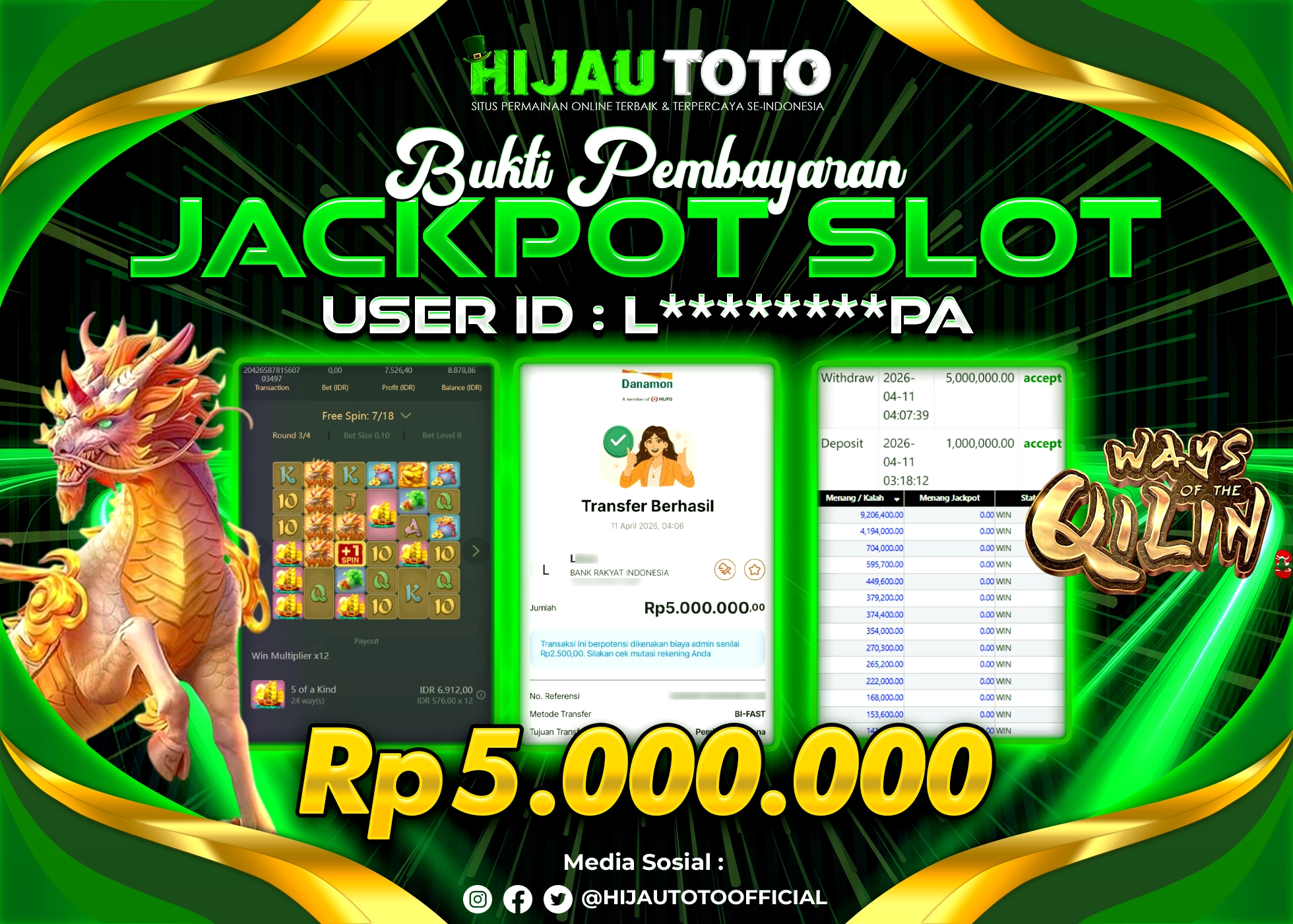 Selamat datang di HIJAUTOTO, tempatnya seru-seruan dan cuan besar! Mulai main cukup dengan modal Rp5.000 aja, taruhan super murah dari Rp100 perak! Mau main slot yang penuh warna? Atau togel dari 20 pasaran paling hits? Atau mungkin tembak ikan yang bikin deg-degan? Tenang, ada juga taruhan bola, sabung ayam, dan live casino yang bikin suasana makin hidup! Daftar sekarang dan dapetin bonus new member 100% langsung, biar modalmu makin tebal. Deposit gampang banget, bisa pakai QRIS, dan kalau butuh bantuan, customer service kita siap 24 jam nonstop. Jadi, tunggu apa lagi? Yuk, gabung dan bawa pulang kemenangannya cuma di HIJAUTOTO!