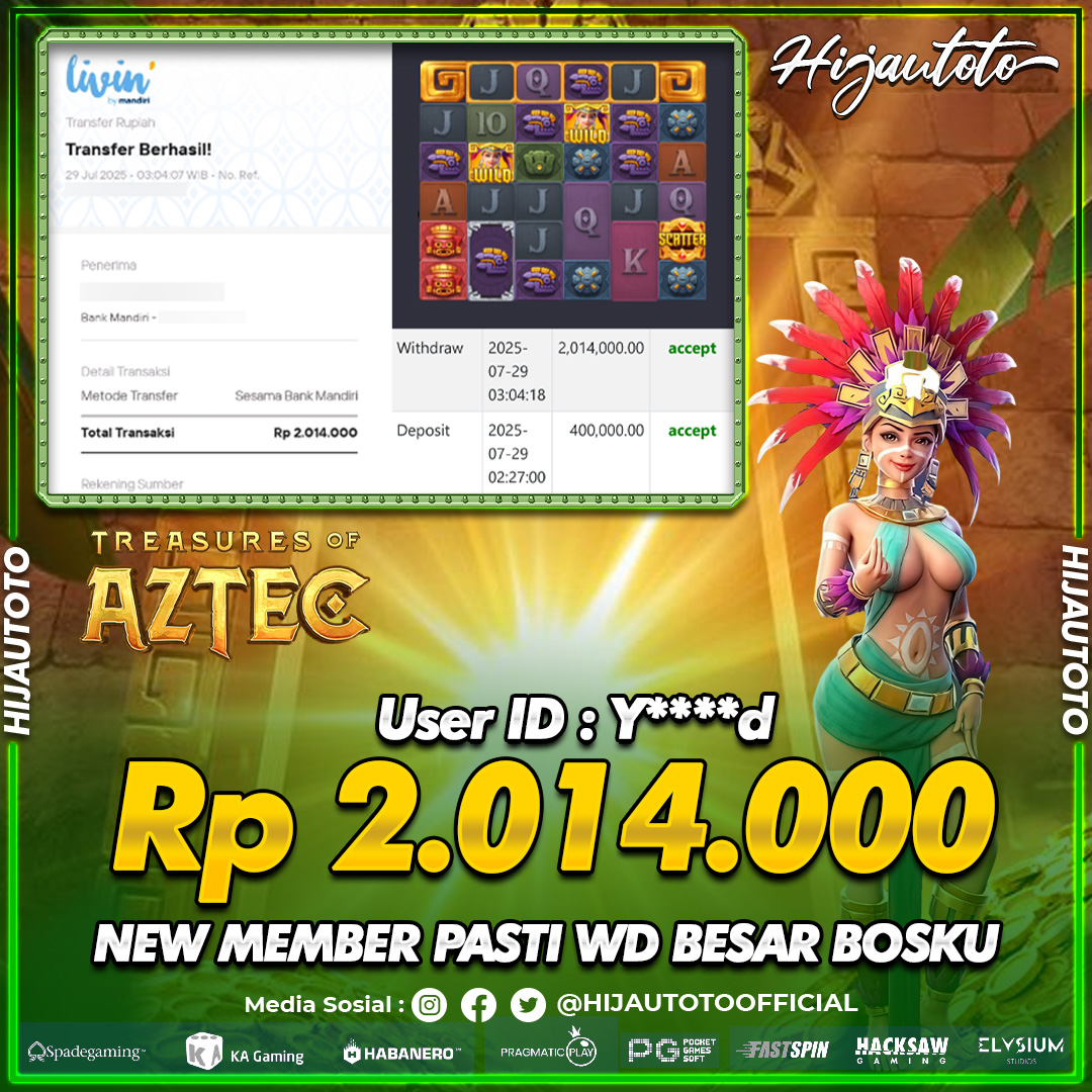 Selamat Kepada Member HIJAUTOTO Y****D Telah Jackpot Di SLOT TREASURES OF AZTEC