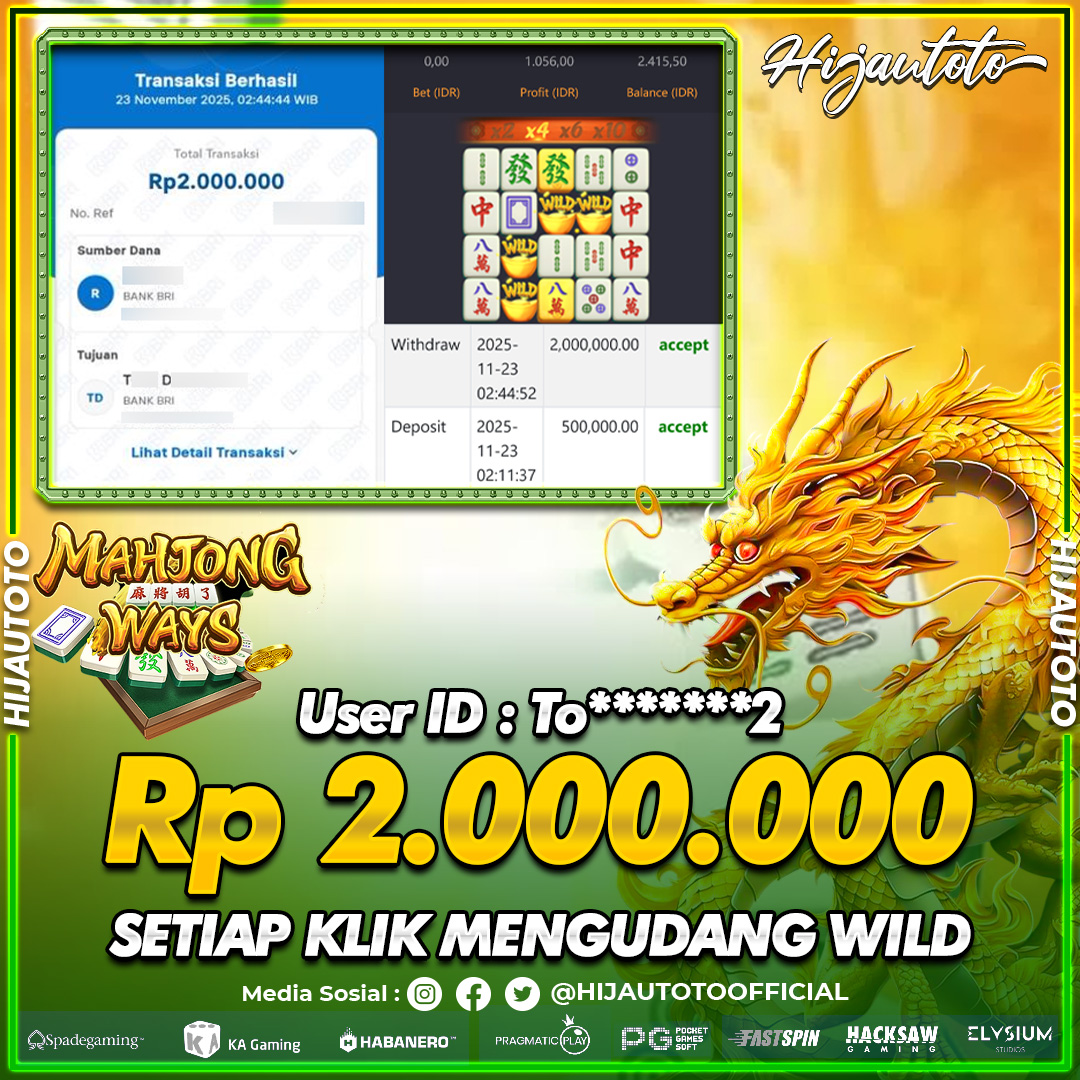Selamat Kepada Member HIJAUTOTO TO*******2 Telah Jackpot Di SLOT MAHJONG WAYS