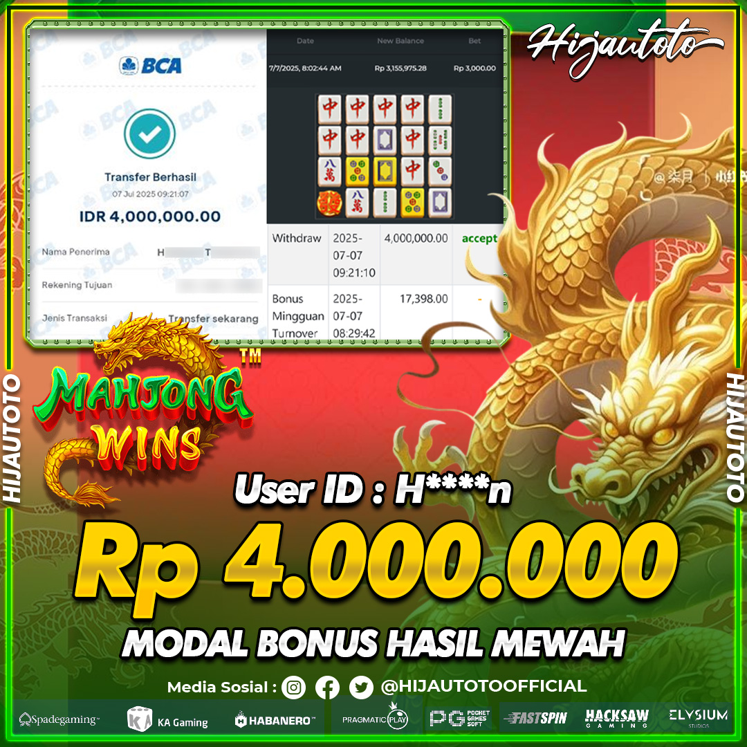 Selamat datang di HIJAUTOTO, tempatnya seru-seruan dan cuan besar! Mulai main cukup dengan modal Rp5.000 aja, taruhan super murah dari Rp100 perak! Mau main slot yang penuh warna? Atau togel dari 20 pasaran paling hits? Atau mungkin tembak ikan yang bikin deg-degan? Tenang, ada juga taruhan bola, sabung ayam, dan live casino yang bikin suasana makin hidup! Daftar sekarang dan dapetin bonus new member 100% langsung, biar modalmu makin tebal. Deposit gampang banget, bisa pakai QRIS, dan kalau butuh bantuan, customer service kita siap 24 jam nonstop. Jadi, tunggu apa lagi? Yuk, gabung dan bawa pulang kemenangannya cuma di HIJAUTOTO!