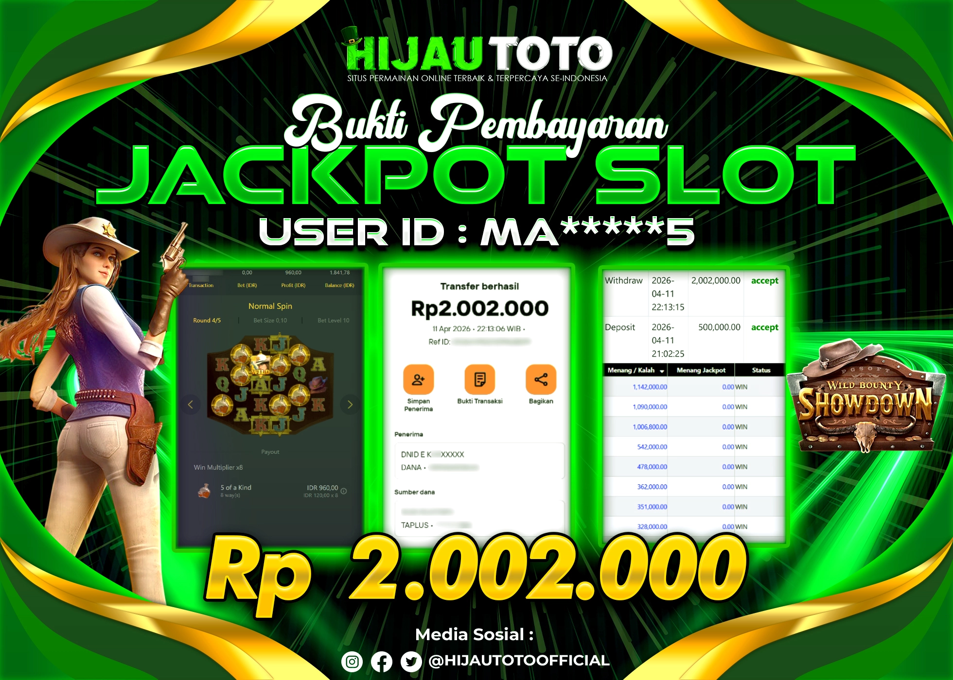 Karena berhasil memenangkan Rp.Rp.2.080.000 dari permainan seru SLOT WILD BANDITO di HIJAUTOTO! πŸ’°πŸ’Έ