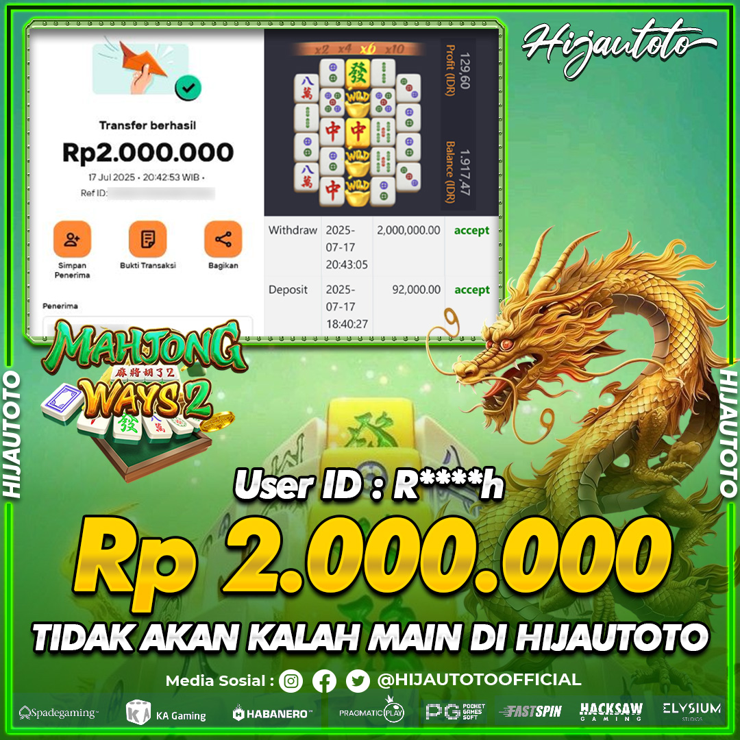 Selamat Kepada Member HIJAUTOTO R****H Telah Jackpot Di SLOT MAHJONG WAYS 2