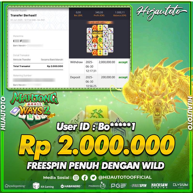 Selamat Kepada Member HIJAUTOTO V**********O Telah Jackpot Di SLOT MAHJONG WAYS 2