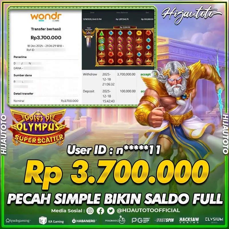 Karena berhasil memenangkan Rp.Rp.3.000.000 dari permainan seru SLOT GATES OF 0LYMPUS SUPER SCATTER di HIJAUTOTO! πŸ’°πŸ’Έ