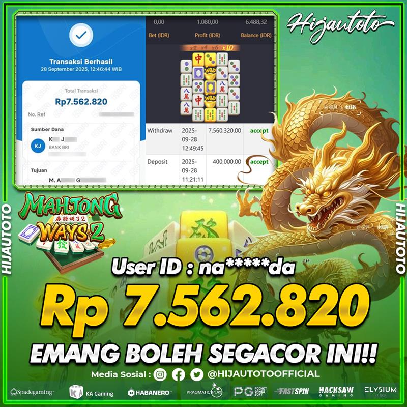 Selamat Kepada Member HIJAUTOTO NA*****DA Telah Jackpot Di SLOT MAHJONG WAYS 2