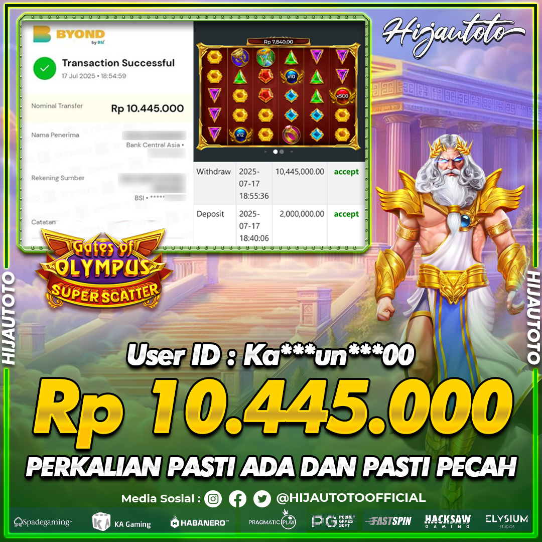 Selamat Kepada Member HIJAUTOTO KA********00 Telah Jackpot Di GATES OF OLYMPUS SUPER SCATTER